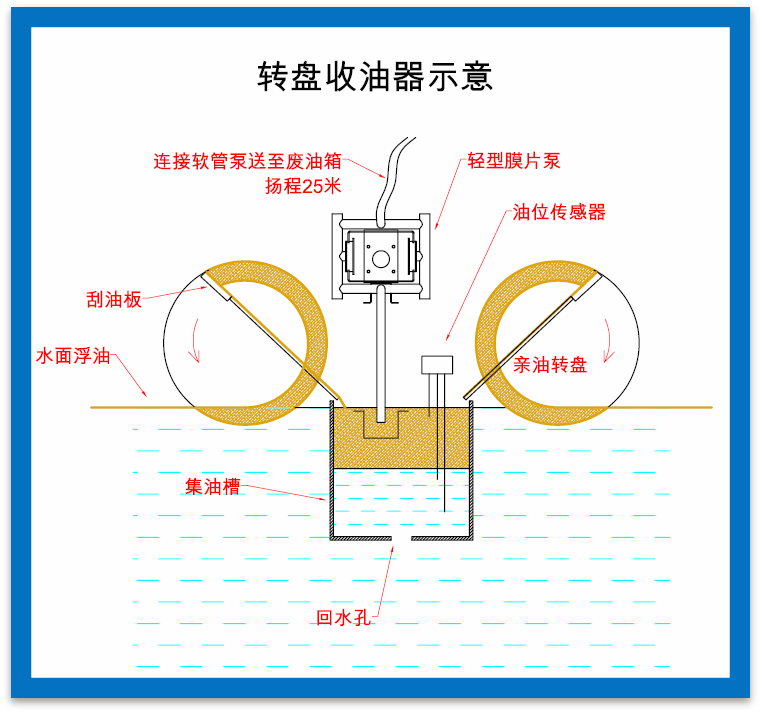 浮動(dòng)轉盤(pán)收油器包括集油轉盤(pán)、集油槽、收油泵、收油檢測系統以及提供浮力的浮子、鋼絲軟管等。